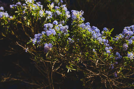 blue pacific Ceanothus tree with flowers in full bloom shot at night time at shallow depth of field