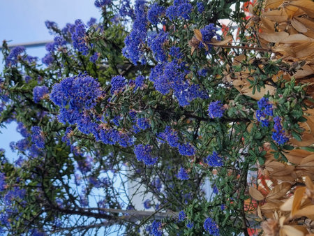 pacific blue ceanothus tree with blue flowers outdoor in sunny backyard shot at shallow depth of field with telephoto lens