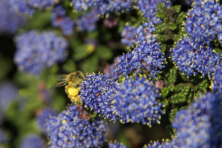 A honey bee, or honeybee, busy collecting pollen in its leg sacs from purple Ceanothus Blue Jeans, Holly Leaf Mountain Lilac Flowers