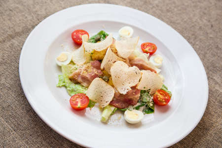 Caesar salad with chicken on a white plate. restaurant menu. Decorated with tomatoes, sprinkled with grated cheese. On a light gray canvas. Decorated with parsley, pepper and tomatoes.