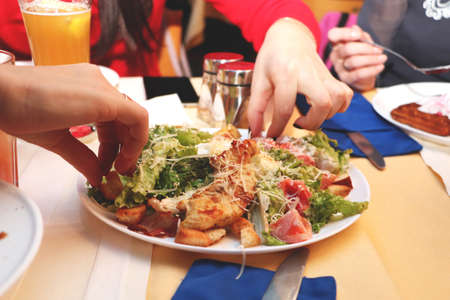 Healthy organic Chicken Caesar Salad with grilled chicken and croutons woman hand