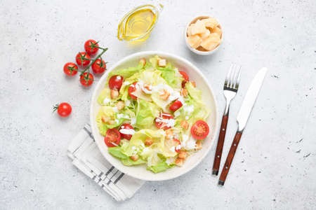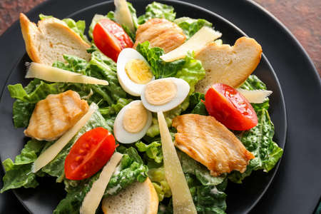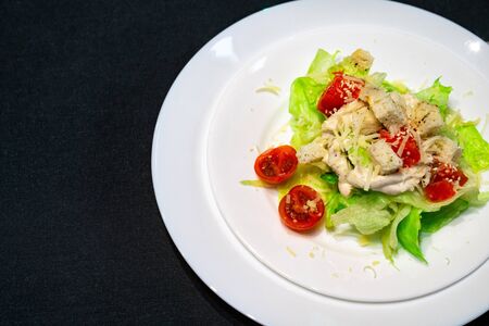 Delicious fresh caesar salad with chicken meat, breadcrumbs, tomatoes and lettuce leaves. Healthy food