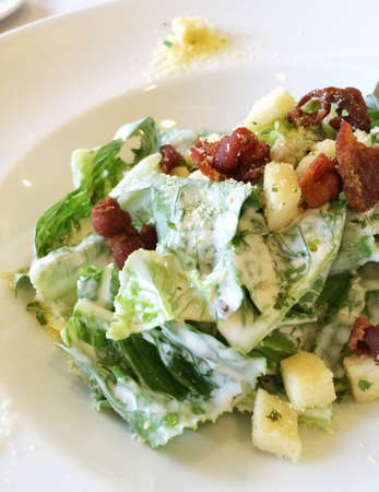 Close up organic caecar salad in white dish with caecar dressing. International food - Image