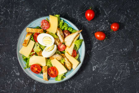 Caesar salad with chicken breast, cherry tomatoes and parmesan on a dark background, copy space