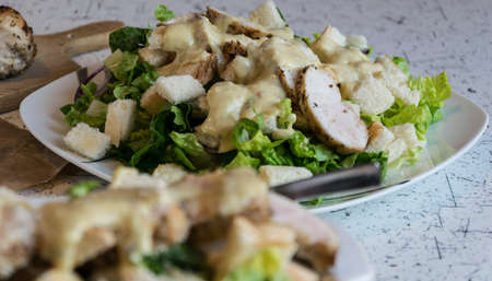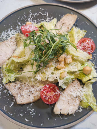 Caesar Salad with grilled chicken, Cheese and Croutons with lettuce, on plate. Grilled chicken breasts and fresh vegetables in plate.