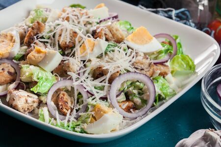 Healthy caesar salad with cheese, eggs, red onion and croutons. Italian cuisine