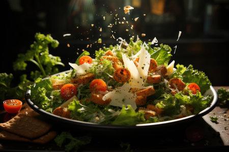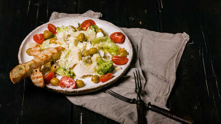 Fresh vegetable with chesse in Caesar salad in black bowl on the dark background