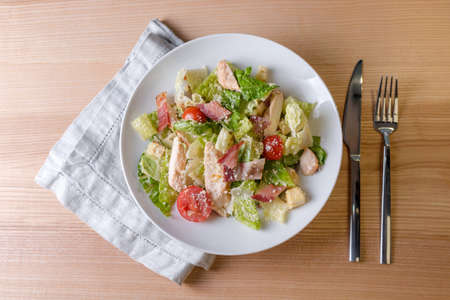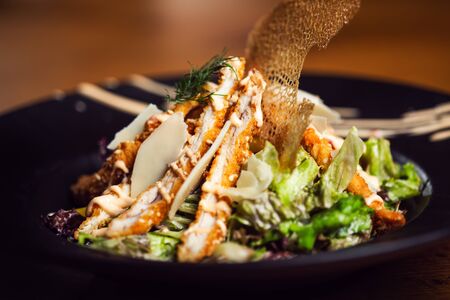 Caesar salad with chicken and greens on wooden table, Caesar salad in an expensive restaurant