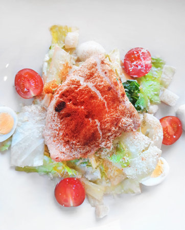 Excellent caesar salad with roasted pastry and chicken, sprinkled with parmesan cheese