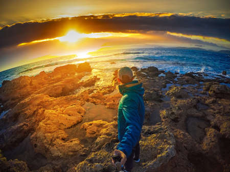 Man with selfie stick by the sea at sunset. Sardinia, Italy