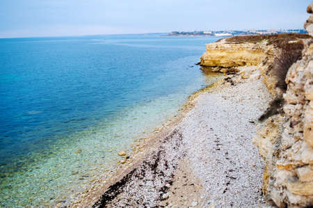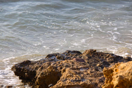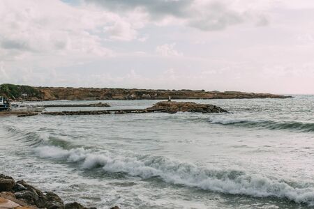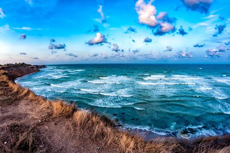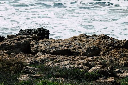 Beautiful view of the restless sea near the stone coast. Natural landscape