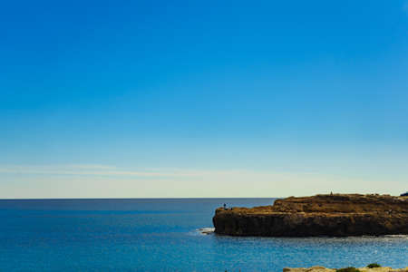 Areal view Island scenery, seascape Spain Majorca, beach bay Cala s'Almunia, beautiful coastline Mediterranean Sea. Balearic Islands, Cliff of Cala S'Almunia in Santanyi