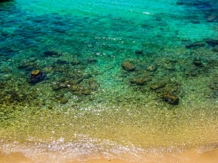 Blue emerald sea water with large stones beach. Rocky shore transparent turquoise bottom Malta