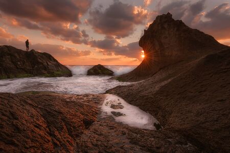 Sunrise at the Coast of Sicily. Dramatic Atmosphere with strong waves and clouds at Santa Flavia near Palermo, Italy in Europe in Autumn, October