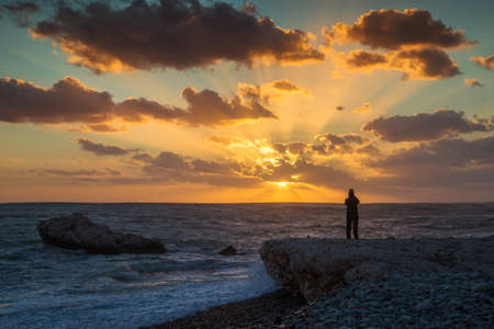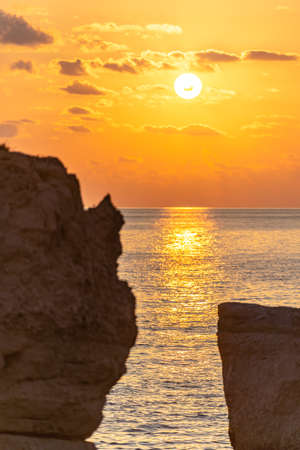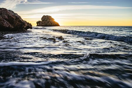 Rocky seashore seascape with wavy ocean and dramatic and beautiful sunset at sea caves coastal area in Paphos, Cyprus