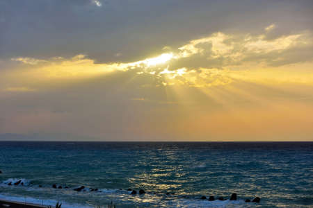 Seascape during sunrise. Beautiful natural seascape. Sea sunrise at the Black Sea coast. Magnificent sunrise with clouds and fire sun. Rezovo, Bulgaria