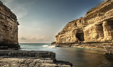 Beautiful view of the sea with long exposure white waves washing the shore, Vama Veche, Black Sea, Romania
