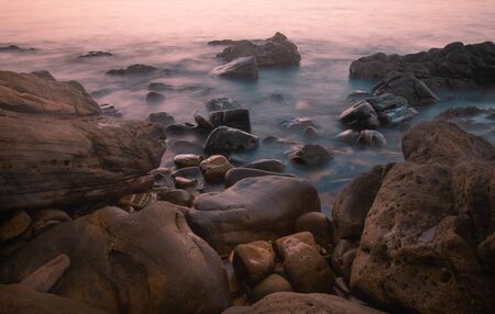 Rocks in Atlantic Ocean by sunset in Nazare, Portugal. Long exposure photography.