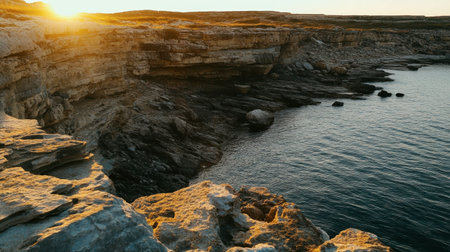 A stunning view of a coastal sunrise casting golden hues over rugged cliffs and tranquil waters. Perfect for nature enthusiasts and travel inspiration.