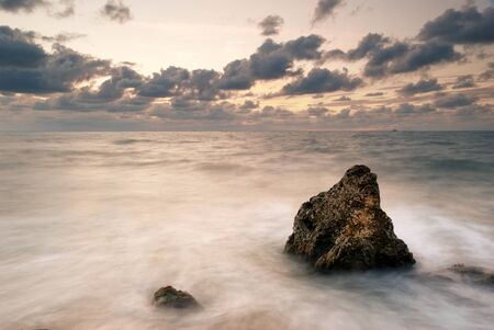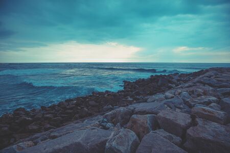 Seascape in the evening. Sunset over the sea. Rocky seashore