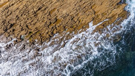 Sea aerial top view, amazing azure water nature background with rock cliff in Cyprus, mediterranean landscape from above.
