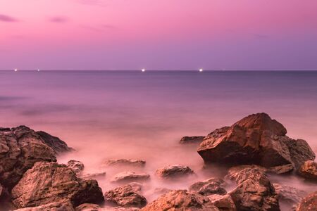 Seascape of still sea waters shore, rocky coastline and romantic pink sunset on summer clear day. Still landscapes of travels and destination scenics