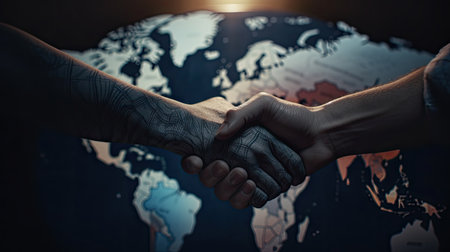 Symbolic handshake between diverse individuals, with a world map backdrop highlighting global business.