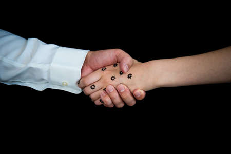 Close-up of man shaking hand of woman with coronavirus COVID-19