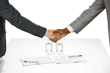 Conceptual display Free Consultation. Business overview meeting to discuss something or to get advice without fee Two Professional Well-Dressed Corporate Businessmen Handshake Indoors
