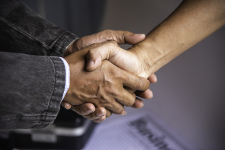 Business investor group holding hands, Two businessmen are agreeing on business together and shaking hands after a successful negotiation. Handshaking is a Western greeting or congratulation.
