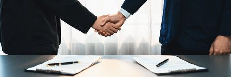 Panorama view of two professionals businessmen shake hands with blurred contract paper on meeting table, signifying successful negotiation and partnership agreement with business handshaking. Prodigy