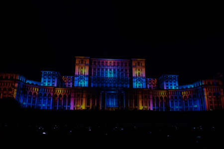 Bucharest, Romania, 21st of September 2019: Projections on Palatul Parlamentului landmark building in Bucharest. The Parliament bathed in light with images for the IMAPP 2019 VideoMapping competition
