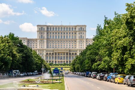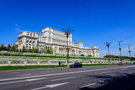 Bucharest, Romania, 6 May 2021: The Palace of the Parliament also known as People's House (Casa Popoprului) in Constitutiei Square (Piata Constitutiei) in a sunny spring day