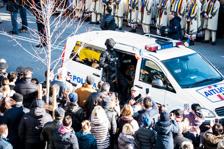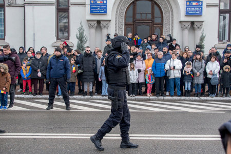 BUCHAREST, ROMANIA - DECEMBER 1, 2014: Officials are taking part to a military parade on National Day of Romania. More than 3,000 soldiers and personnel from security agencies take part in the massive parades on National Day of Romania.