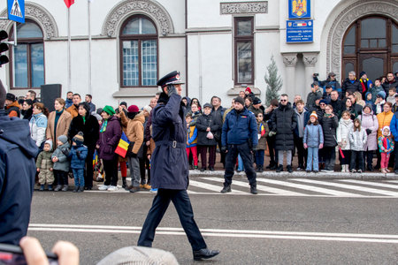 Bucharest, Romania - 12.01.2021: Children holding the national flag attending at the unity day national military parade in Bucharest.