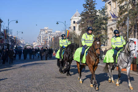 IASI, ROMANIA - JANUARY 24, 2018: Happy smiling local police equestrians in green uniform and helmet on horses patrolling on the main street at the national day of unification Romania, tricolor flag