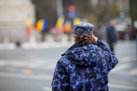 TIMISOARA, ROMANIA - DECEMBER 1, 2016: Military parade at Romanian National Day. Woman cop give one official salute. Picture taken in front of the Administrative Palace in Timisoara.