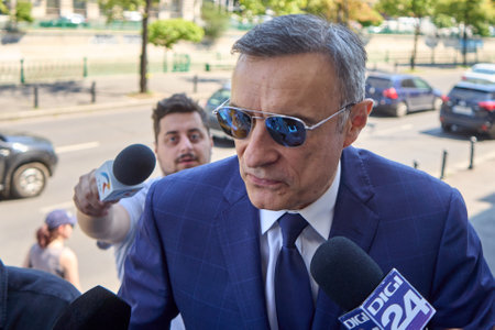 Bucharest, Romania - August 5, 2021: Details with the Romanian Government logo during a press conference held by a politician.