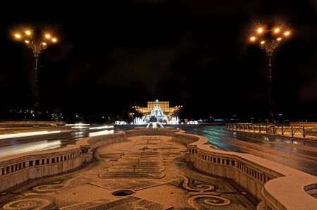Fountain Alexandru Ioan Cuza lighted and ornaments in front of The House of People, downtown of Bucharest, Romania night time.