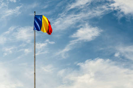 National Flag of Romania at Pole Blue Sky