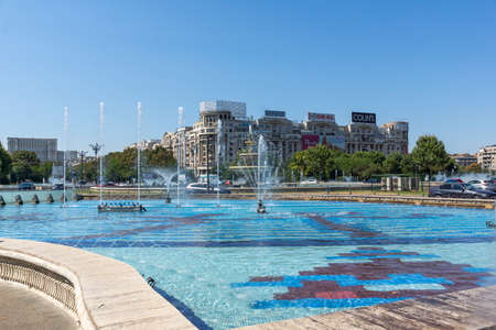 BUCHAREST, ROMANIA - AUGUST 16, 2021: Fountain at Unirii Square at the center of city of Bucharest, Romania