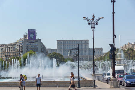 BUCHAREST, ROMANIA - AUGUST 17, 2021: Fountain at Unirii Square at the center of city of Bucharest, Romania