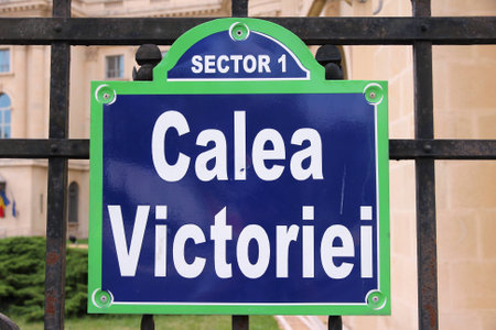 Bucharest, capital city of Romania. Typical street sign at Victory Street (Calea Victoriei).