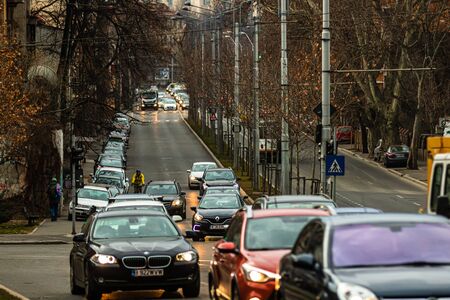 Car traffic at rush hour in downtown area of the city. Car pollution, traffic jam in the morning and evening in the capital city of Bucharest, Romania, 2020