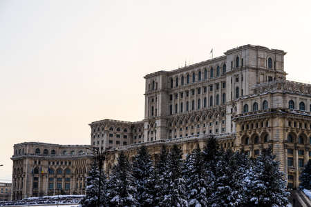 Detail photo of the famous Palace of the Parliament (Palatul Parlamentului) in Bucharest during winter season