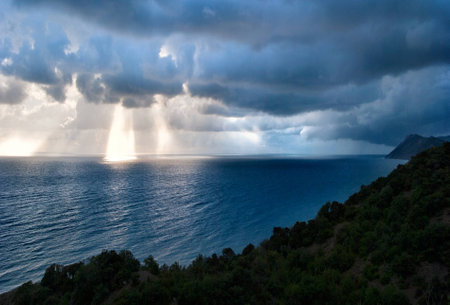 Sunray's breaking through the clouds after heavy rain at the coast of the Black Sea, Russia