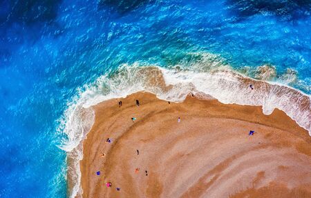 surf waves and turquoise sea on the beach in Rhodes Greece, top view from the throne