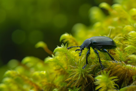 Black beetle perched on vibrant leaves, showcasing intricate details and textures. Nature and entomology concept with green background.