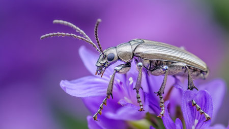 Photo of a long, silver beetle on a purple flower, in the style of Canon EOS R5. --ar 53:30 --v 6.1 Job ID: 831073fd-cd4b-41aa-b06b-59828e1efa58