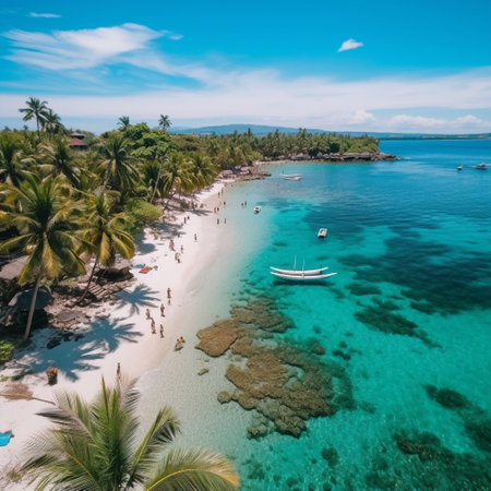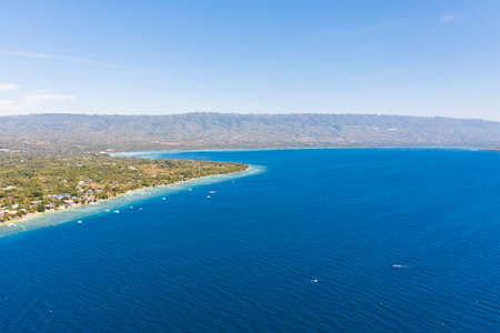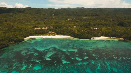 Aerial view of tropical beach on the island Bohol, Anda area, Philippines. Beautiful tropical island with sand beach, palm trees. Tropical landscape: beach with palm trees. Seascape: Ocean, sky, sea. Travel concept.